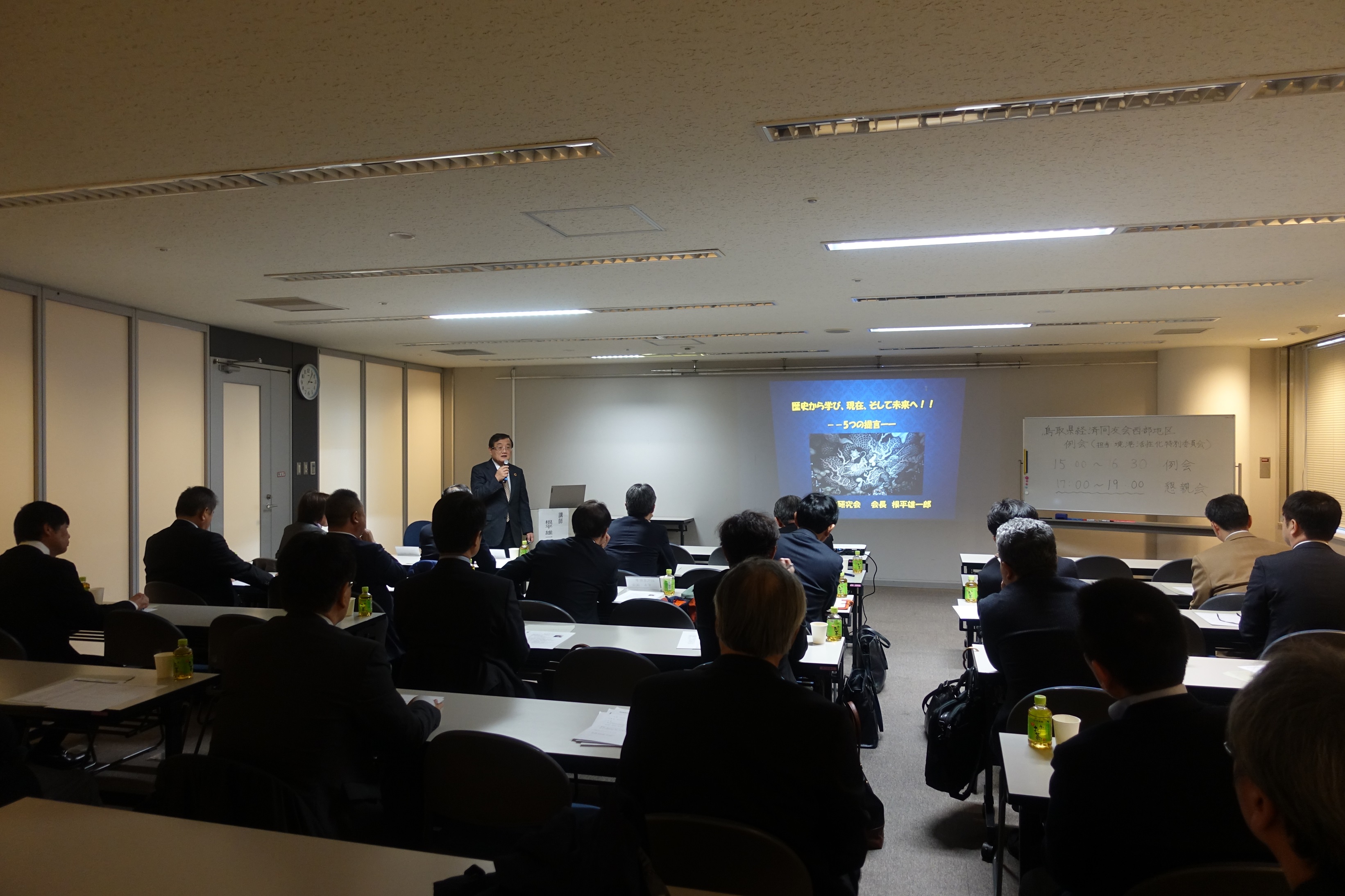 この度は、かつて境港市教育委員会教育長をお務めになった根平氏を講師にお招きし、「歴史を学び、現在、そして未来へ!!」(5つの提言)と題して、境港市にまつわる今後の提言についてご講演を頂きました。